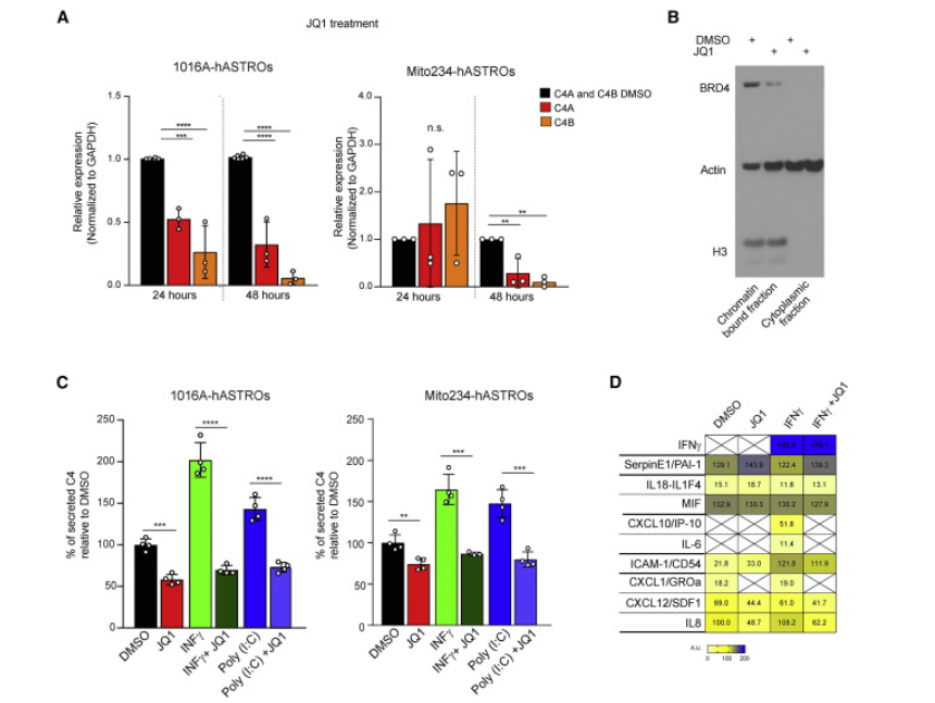 随后,研究人员结合ELISA的测定法与分析连接图(CMap)数据集,探索和确认了能调节C4的途径,他们发现染色质重塑抑制剂(BRD和HDAC抑制剂),NF-κB,JAK和JNK抑制剂等除了减少人类星形胶质细胞的C4分泌,还阻断了对促炎刺激的反应。