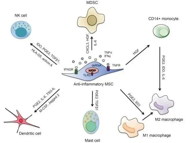 此外,间充质干细胞通过调节可溶性因子(包括HO-1、IDO和TGF-β)来增强Tregs的数量和IL-10分泌。间充质干细胞还通过诱导半成熟DC表型和增加M2巨噬细胞的IL-10分泌来促进Treg功能。